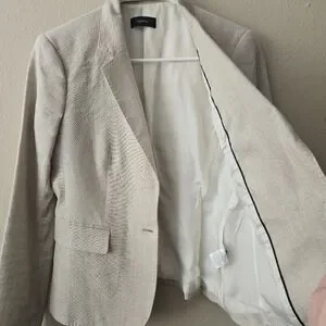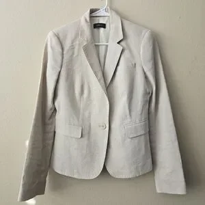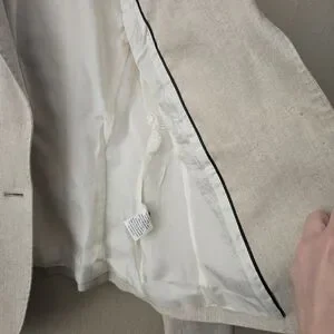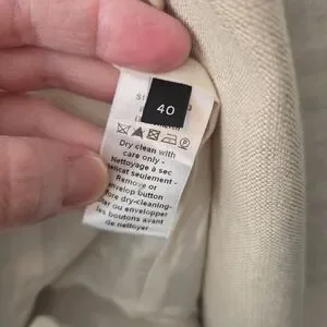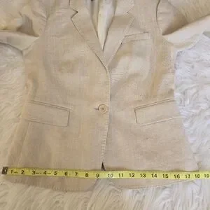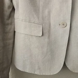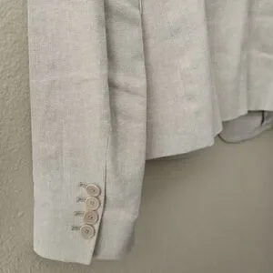 The Joseph Linen Notched Collar Two Button Blazer Jacket is in a European size 40. Made from high-quality linen with a solid beige color, this jacket features a classic button closure and a flattering notched collar. The blazer style and elevated basic design give off an air of old money sophistication, perfect for a polished and timeless look. Crafted in Poland by the brand Joseph, this jacket is sure to make a statement with its timeless style and quality construction.