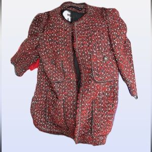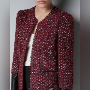 Stylish red tweed jacket with black accents. Perfect for a sophisticated look.