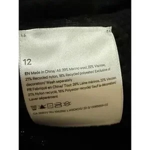 Materials (per tag): 39% merino wool, 22% viscose, 21% recycled nylon, 18% recycled polyester; exclusive of decoration.