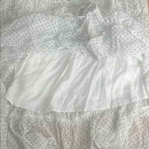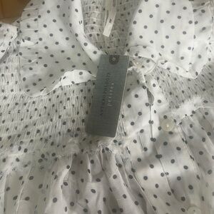 Imported Chic white dress with black polka dots. Features short sleeves and a collared neckline.