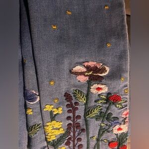 Stylish blue jeans with vibrant floral embroidery. Perfect for adding a touch of elegance to your casual wardrobe.