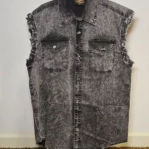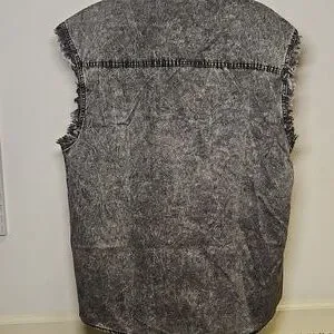 Stylish and rugged, this faded black denim sleeveless button down is perfect for a casual look. Featuring a frayed edge design, it adds a touch of edginess to your outfit.