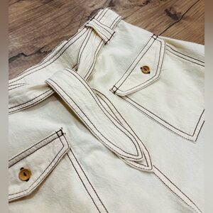 Free People Ynez retro-style shorts in a bone beige/cream tone. Features a flattering belted tie waist and statement front button pockets for a vintage-inspired look. New without tags.