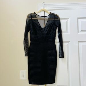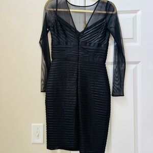Sophisticated black dress with sheer long sleeves. Ideal for formal events. Modern and elegant style.