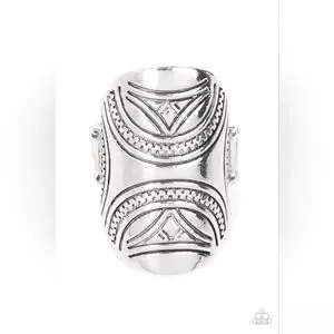 Stamped in triangular tribal inspired motifs, a silver oval frame curls around the finger for a rustic flair. Features a stretchy band for a flexible fit.