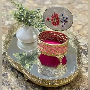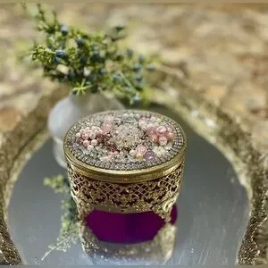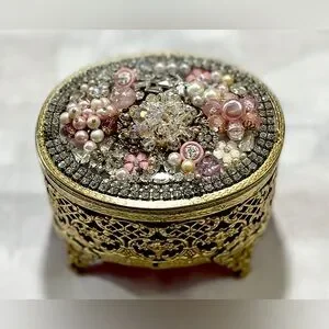 Add a touch of glamour to your vanity or display shelf with this stunning vintage brass jewelry box, fully hand-embellished using curated vintage rhinestones, pearls, and jewelry pieces. Every detail has been thoughtfully arranged to create a sparkling, heirloom-style treasure.