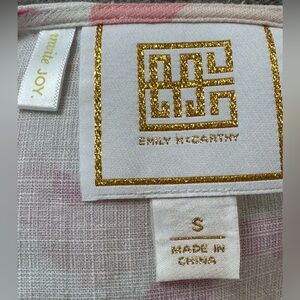 Emily McCarthy abstract bold floral wrap front blouse. Pockets, tie front or back. Size small, rayon/linen. Hand wash, hang dry.
