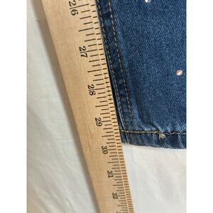 The denim fabric has a mid-rise and a regular fit, with rhinestone accents adding a touch of glam to the overall look.