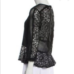Sheer back. Lined front. Zipper back closure. Mesh panels. Button cuffs. 3/4 sleeve