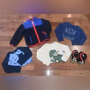 Boys 5T Cozy Bundle – Fleece Jacket, Dino Tops, Cars Tee & Mickey Slippers 9/10