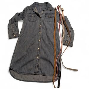Stylish, collared button down, denim dress. Includes multiple belts for versatile styling. Perfect for casual wear, approximately 25" long from shoulder to hem.