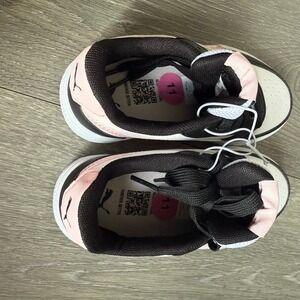 Keywords: Puma sneakers, kids athletic shoes, girls sneakers, black pink white shoes, leather sneakers, lace up shoes, low top sneakers, casual shoes, playground shoes, everyday wear, sporty style, trendy kids fashion, Puma kids, fashion sneakers