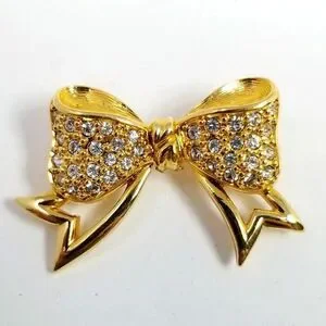 Vintage Rhinestone Encrusted Bow Shape Brooch Gold Tone Lapel Pin, Festive