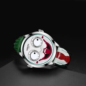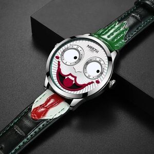 Unique NIBOSI watch featuring a playful joker face design. Green and black leather strap adds a bold touch.