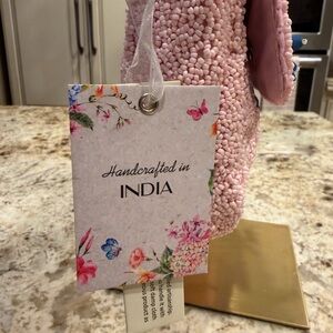 Handcrafted in India Pink Beaded bag with blue Floral design