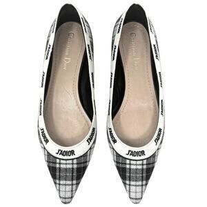 Christian Dior J’Adior Plaid Flats in black and white tartan wool—a rare, cold-weather-ready take on the iconic flat. These pointed-toe Dior flats feature the instantly recognizable J’Adior embroidered ribbon trim and a sleek silhouette that perfectly blends Parisian edge with cozy sophistication. Size 38 EU (approx. US 7.5–8), fits true to size.