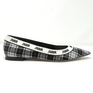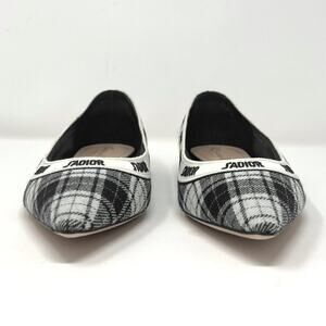 Dior J’Adior Plaid Flats Tartan Wool Pointed Toe Logo Trim Black White 38