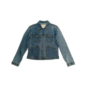 * Made from durable cotton denim with a solid blue color, this jacket features a classic button closure, collared neckline, and long sleeves.