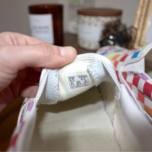 Vibrant checkered design. Easy slip-on style. Comfortable for all-day wear.