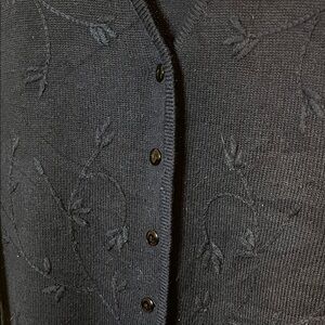 Kim Rogers dark blue button up cardigan with a floral pattern in the same color