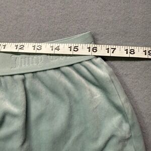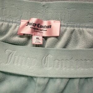 Juicy Couture velour sleep shorts in a light blue hue. Elastic waistband with repeated Juicy Couture logo. Back features a prominent 'Juicy' logo embellished with rhinestones. Crafted for comfort and signature style, these shorts offer a soft feel and a touch of sparkle.