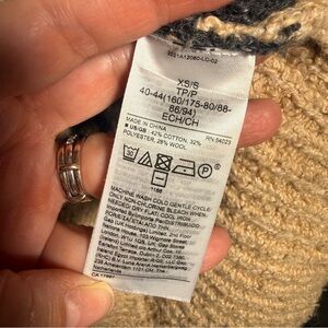 Chic knit vest with a bold pattern. Features a cozy texture. Ideal for layering. XS/Small women's tan and dark grey oversize chunky sweater vest. Measures 22" pit to pit and 26" long. Excellent preowned condition.