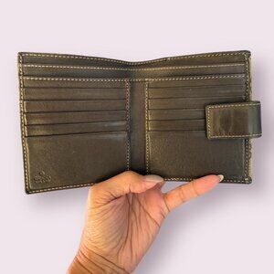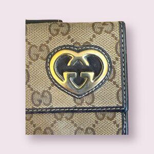 Classic Gucci Lovely Heart French Flap Wallet crafted in signature GG monogram canvas with contrasting leather trim and iconic heart logo hardware. A timeless, compact style with thoughtful organization, perfect for everyday use or as a chic vintage Gucci piece. Snap closure keeps contents secure while maintaining a slim profile.