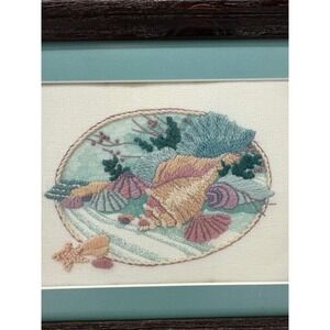 Framed Seashell Crewel Embroidery Art Coastal Beach Decor Nautical Home Accent