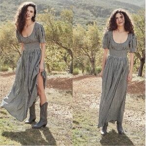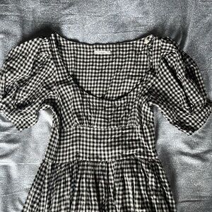 The Doen Kennedy black/white gingham maxi dress. Flowy and slightly sexy. Size is medium, and fits more like a size 8-10. Zips up from the side and has comfortable sleeves. This piece is gently worn.