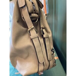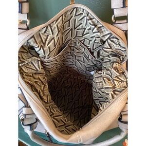 Elevate your everyday style with this chic Marc New York handbag. The soft beige faux leather offers a luxurious feel, while the intricate dark braided trim along the front adds a sophisticated touch. Dual top handles provide comfortable carrying, and the zippered exterior pocket on the back offers convenient access to your essentials. Open the top zipper to reveal a beautifully patterned interior with multiple compartments, perfect for organizing your belongings. This versatile bag is ideal for daily errands, weekend brunches, or a stylish evening out. This bag was preloved and does have minor discoloration, nothing major, pic shows one scratch found on back, handles are in excellent condition