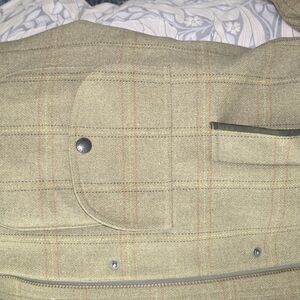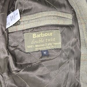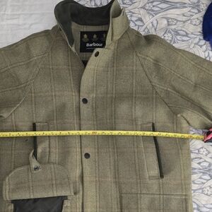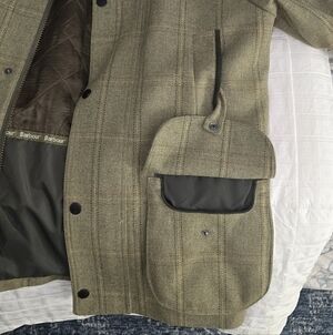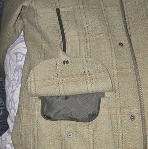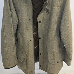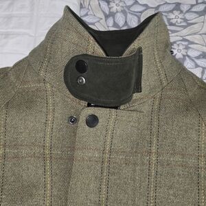 Stylish Barbour coat with a check pattern. Features front pockets and button closure. Perfect for field use.