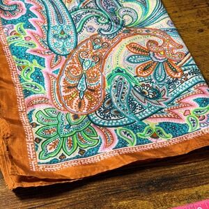 Beautiful Vismaya silk scarf featuring an intricate paisley and floral motif in vibrant shades of pink, teal, green, and ivory, framed by a rich satiny rust border. Crafted from 100% silk with a smooth, lightweight hand and softly finished edges. A statement accessory that works effortlessly as a neck scarf, hair wrap, or bag accent.