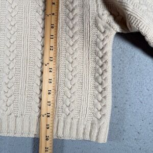 Cream cable knit turtleneck sweater from Banana Republic. This cozy knit features classic cable detailing and a comfortable turtleneck design. Perfect for a casual outing or a sophisticated office look.