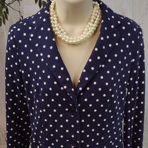 Stylish navy blazer with white polka dots. Ideal for casual or formal wear.
