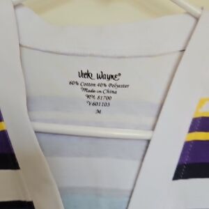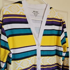 This eye-catching cardigan features a lively mix of yellow and purple stripes, perfect for adding a pop of color to your outfit. Made from a lightweight knit, it's ideal for layering and casual wear. The V-neck design enhances its stylish appeal.