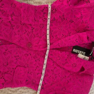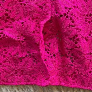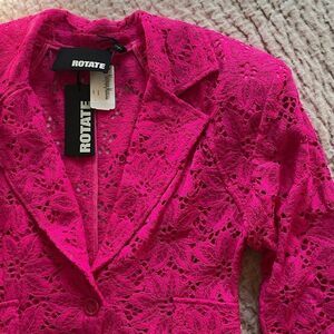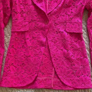 Chic and stylish lace blazer. Vibrant pink hue. Perfect for any occasion. Has removable shoulder patting.
