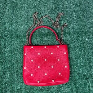 Kate Spade red leather crossbody bag adorned with pearl and stud embellishments. Features a top handle and a detachable silver-tone chain strap for versatile carrying options. The interior is lined with black and white striped fabric and includes a zippered compartment.