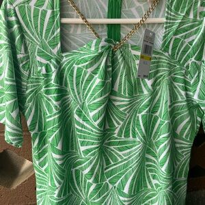 Elevate your wardrobe with this stylish green leaf print top from Michael Kors. Perfect for any occasion, this top combines comfort and fashion effortlessly.