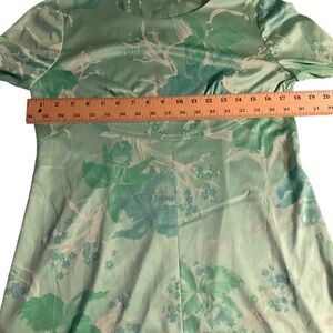 This charming 60's style dress features a lovely mint green floral print. With its 3/4 sleeves and subtle A-line silhouette, it's perfect for a touch of vintage flair at any event. Handmade this dress offers a medium fit with a slight stretch for comfort.