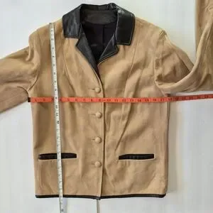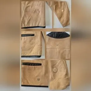 This vintage Genuine Buckskin Hip Length Jacket is a stylish choice for women in size 8. The contrasting black leather collar adds a touch of sophistication to the boxy fit design, making it perfect for both casual and party occasions. Made from suede with a satin polyester lining, this short jacket features a button closure and long sleeves, ideal for fall and spring seasons. The solid beige color with accents of black leather gives this basic jacket a boho hipster theme that is sure to stand out.