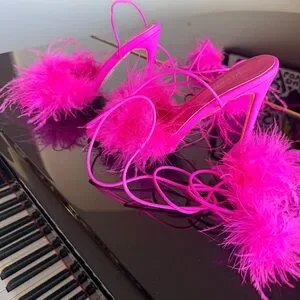 Fuchsia heels with feather accents. Eye-catching and glamorous.
