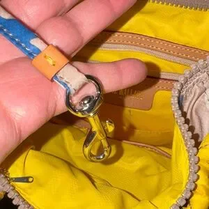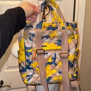 Stylish quilted backpack by MZ Wallace. Features vibrant yellow, blue, and tan design. Ideal for versatile use. this is a hard to find camouflage print. In very good condition aside from a small ink marking on the inside by the brand tag. Some dust on the bottom (outside) can be wiped off. Please see pictures. Has multiple compartments can be used as a tote. Has zip closure as well as a pull closure adjustable straps