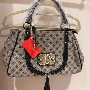 Chic satchel with signature DB pattern. Features black accents and tassel detail. Ideal for versatile styling.