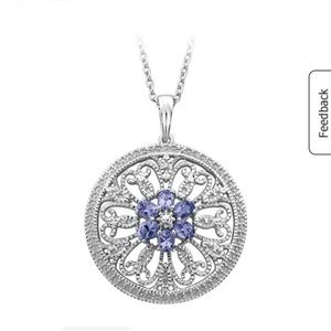 Elegant sterling silver filigree pendant necklace featuring a beautiful round floral design with tanzanite-colored stones accented by sparkling white topaz.