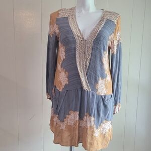 Tribal Print Long Sleeve Tunic Lightweight Short Dress Summer Cover-up Size L. Please see photos for details. Excellent Pre-owned condition. Easy to wear. Relax fit. Dress up or down. 38" chest 40" hip measurements.