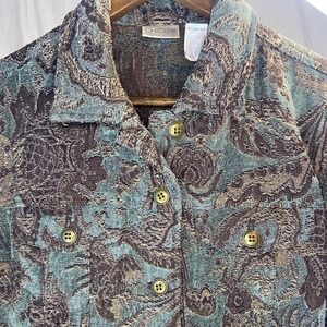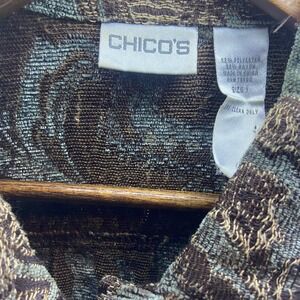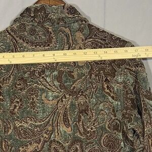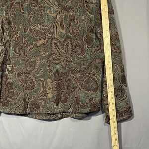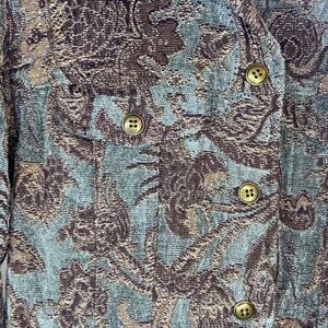 Chicos brocade jacket blazer boasting a rich paisley pattern in green and brown tones. This stylish piece features a classic button-front closure and a flattering silhouette, perfect for adding a touch of sophisticated flair to your wardrobe. Its intricate textured fabric makes it a standout choice for a business casual event or a stylish evening out.