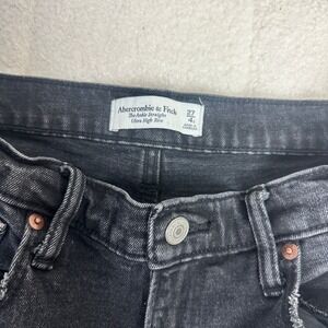 Keywords: Abercrombie & Fitch, Black Denim Shorts, Womens Shorts, Size 27, Ultra High Rise, Distressed Hem, Faded Black Wash, Denim Cutoffs, Casual Shorts, Summer Shorts, Festival Fashion, Contemporary Style, Five Pocket Shorts