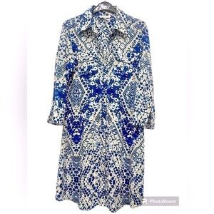CAbi blue and white jewel print shirt dress roll tab sleeves