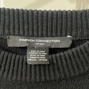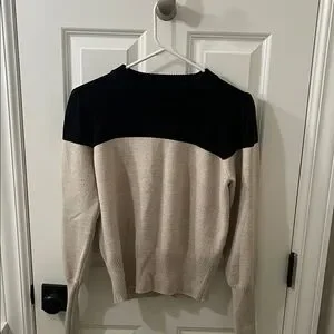 Elegant crew neck sweater with a black and cream colorblock design. Ideal for versatile styling.