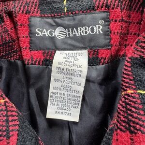 This vintage Sag Harbor red and black plaid blazer jacket in size 12 is a stylish addition to any woman's wardrobe. Made from acrylic with a basic jacket style, this piece is perfect for adding a pop of color to any outfit. The classic plaid pattern and timeless design make it a versatile option for various occasions. Embrace the colorful theme and showcase this unique blazer with pride.